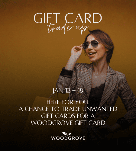 Visit Guest Services from January 12 – 18 to trade in your unwanted Gift Cards* in value of $25 to $100 for a Woodgrove Centre Gift Card.**